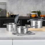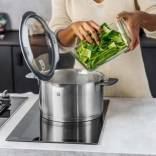 A ZWILLING Simplify öt darabos edénykészlet elegáns dizájnt, magas tartósságot és átgondolt funkciókat ötvöz a mindennapi főzéshez. Az üvegfedők szilikon peremmel stabilan illeszkednek, beépített szűrővel rendelkeznek a gyors leszűréshez, és függőleges helyzetben rögzíthetők a fazék peremére – kevesebb csepp a pulton, több hely munka közben.
