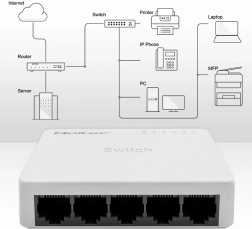 Megbízható Qoltec hálózati kapcsoló 5 RJ45 porttal 10/100 Mb/s sebességhez, amely stabil és zökkenőmentes adatátvitelt biztosít otthoni és irodai hálózatában. A Plug & Play technológiának, az automatikus MDI/MDI‑X-nek, a LED jelzésnek és az árnyékolt, 8 pines portoknak köszönhetően könnyedén bővítheti a hálózatot bonyolult konfiguráció nélkül; az eszköz akár 1024 MAC-címet támogat, a jel hatótávolsága pedig akár 150 m.