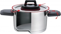Az edény egyik fő előnye az összecsukható fogantyúk a testén és a fedelén, amelyek megkönnyítik a tárolást és helyet takarítanak meg.