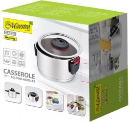 Bemutatjuk a Maestro rozsdamentes acél edényt, amely kiváló minőségű rozsdamentes acélból készült, biztosítva a tartósságot és hosszú élettartamot. Többrétegű talpa hőfelhalmozással gondoskodik az egyenletes melegítésről és a hőmérséklet fenntartásáról, így hatékony főzést biztosít.
