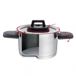 Az edény felszerelt egy üvegfedéllel gőzkieresztő nyílással, amely lehetővé teszi a főzési folyamat megfigyelését anélkül, hogy folyamatosan emelgetni kellene. Az összehajtható fogantyúk révén az edény könnyen tárolható és értékes helyet takarít meg a konyhában.