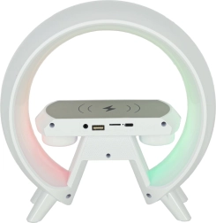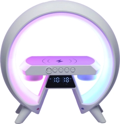 Multifunkcionális RGB lámpa fehér kivitelben, amely a modern dizájnt praktikus funkciókkal egyesíti, mint vezeték nélküli töltés, Bluetooth hangszóró, FM rádió és ébresztőóra.