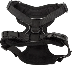 A háton integrált fogantyú a gyors megtartáshoz, robusztus csatok és fém D-gyűrű a póráz biztos rögzítéséhez.
