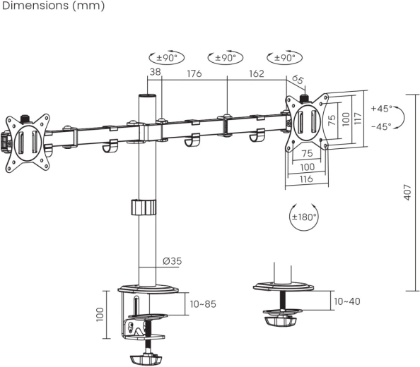 Ez az univerzális asztali tartó két LCD, LED vagy különböző márkájú monitor felszerelésére alkalmas, 17"-től 32"-ig terjedő képátlóval. Nagyobb képernyők is felszerelhetők, amennyiben nem lépik túl a maximális súlyt és megfelelnek a VESA szabványnak. A tartó nagyobb munkakomfortot biztosít a dőlésszög, forgatás és magasság szabályozásával, optimalizálva az ergonómiát és a láthatóságot.