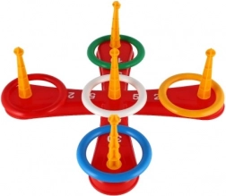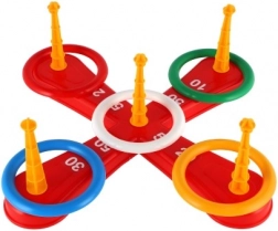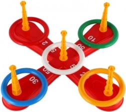 A játék tartalmaz egy keresztet alapot és színes karikákat a szórakoztató dobáláshoz.