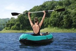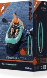 A könnyű és strapabíró BESTWAY felfújható kajak ideális nyugodt kirándulásokhoz tavakon és csendes folyókon. A masszív vinil szerkezetnek és a nejlon bevonatnak köszönhetően ellenáll a kilyukadásnak, az UV-sugárzásnak, valamint a víznek és olajoknak. Állítható háttámlával, körbefutó biztonsági kötéllel, stabilitást adó, levehető uszonnyal rendelkezik, a csomagban pedig megtalálható a kétrészes alumínium evező és a kézi pumpa is. Teherbírása akár 130 kg, a masszív fogantyúk pedig megkönnyítik a hordozást.