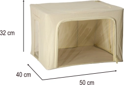 A belső fém/stabilizáló keret tartja a doboz alakját, így félig töltve sem roskad össze. A tartós poliészter és a minőségi cipzárak biztosítják az eltett textíliák tisztaságát és védelmét. Kiürítés után a doboz könnyen összehajtható és eltehető, így helyet takarít meg.