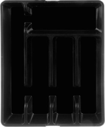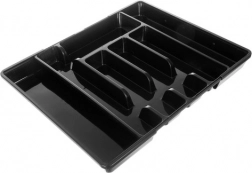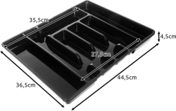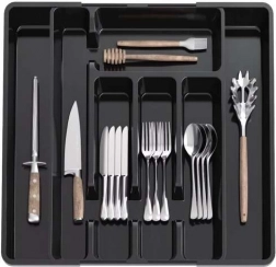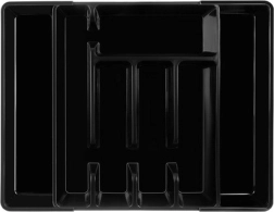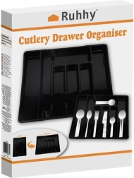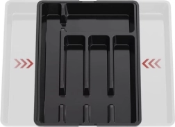 Praktikus fekete, fiókba helyezhető rendező bővíthető mechanizmussal, amely könnyen igazodik a fiók szélességéhez, és minden evőeszközt, illetve konyhai eszközt a helyén tart. Tartós PP anyagból készült, sima felülete megkönnyíti a tisztítást, és akár 7 áttekinthető rekeszt kínál. Ideális sokoldalú használatra, gyors rendszerezésre és modern megjelenéshez minden konyhában.