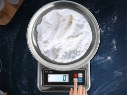 A digitális mérleg 0-5 kg-os mérési tartományt kínál 1 g pontossággal, biztosítva az összetevők pontos mérését.