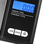 A 0,01 g felbontás és a 200 g kapacitás pontos mérést biztosít fémekhez, kövekhez és finom mintákhoz. Tökéletes profiknak és igényes otthoni használatra.