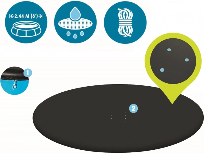 Tartsa tisztán a medence vizét erőfeszítés nélkül. Ez az univerzális BESTWAY takaró a 244 cm átmérőjű, peremes, felfújható szegélyű, összeszerelhető medencékhez megbízható védelmet nyújt a szennyeződésekkel szemben, vízelvezető nyílásokkal rendelkezik a víz felgyülemlése ellen, valamint rögzítő zsinórral a stabil rögzítésért. Tartós PVC anyagból készült a hosszú élettartam és a könnyű karbantartás érdekében. Ideális kiegészítő a medence gyors védelméhez a lehulló levelektől, rovaroktól és portól.