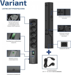 Az elosztó öt földelt aljzattal rendelkezik gyermekvédelemmel, amely megakadályozza a gyermekek hozzáférését a feszültség alatt álló részekhez. További funkciók: LED jelző a túlfeszültség-védelem állapotának kijelzésére, automatikus biztosíték a gyors és egyszerű visszakapcsoláshoz, valamint kétsarkú, háttérvilágítással ellátott kapcsoló.