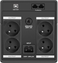A négy 230 V-os (E típus – francia) kimeneti aljzat egyszerre több eszköz tápellátását teszi lehetővé. Az áttekinthető LED jelzők tájékoztatnak a Backup/Normal/Overload állapotokról, míg az USB interfész a PowerManager II szoftverrel felügyeletet és biztonságos rendszerleállítást kínál.