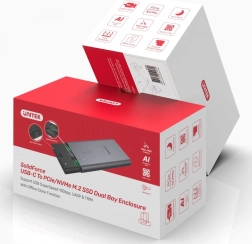 A kettős, kiváló minőségű chipkészlet UASP támogatással hatékony parancskezelést tesz lehetővé, és akár több tíz százalékkal nagyobb sebességet nyújt a hagyományos USB‑hez képest. A TRIM támogatás segít fenntartani a következetes teljesítményt és meghosszabbítani az NVMe meghajtók élettartamát. Az alumínium ház beépített ventilátorral és a mellékelt hővezető párnákkal stabil hőmérsékletet biztosít még hosszan tartó átvitelek során is. A Secure‑Lock mechanizmus véd a véletlen kinyitás ellen, és lehetővé teszi a gyors, szerszám nélküli meghajtócserét.