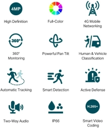 Kiemelkedő 4G kijelző teljes színben egész napos megfigyeléssel, tekintet nélkül a sötétségre. Könnyű telepítésének és 360°-os lefedettségének köszönhetően ez a kamera ideális megoldás az internet nélküli megfigyeléshez.