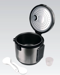 A Maestro multifőző ideális választás családi főzéshez. A 5 literes kapacitásnak köszönhetően leveseket, párolt ételeket, rizst, kásákat és desszerteket is elkészíthet több személyre. A 700 W teljesítmény gyors és hatékony működést biztosít, míg a rozsdamentes acél és tartós műanyag modern megjelenést és hosszú élettartamot ad a készüléknek.