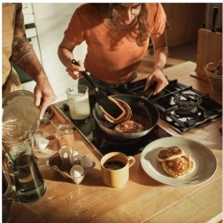 A háromrétegű talp gyors és egyenletes melegítést biztosít, ami az eredményes főzést segíti elő. Ergonomikus fogantyúja akkor is hideg marad, ha sütőben, akár 150 °C-ig használva. Ez a serpenyő minden tűzhely típuson, beleértve az indukciósokat is, használható, és a mosogatógépben is mosható.