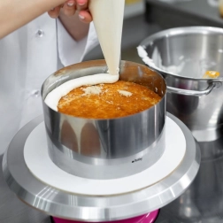 A univerzális, minőségi rozsdamentes acél keret ideális piskótalapok sütéséhez, több réteg összeállításához és hideg desszertek készítéséhez. Az extra 20 cm magasság bőséges teret ad magas tortáknak, haboknak és sajttortáknak. A masszív, bepattintható kapcsok megtartják a beállított átmérőt és stabilitást biztosítanak még maximális széthúzásnál is.