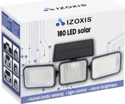 Az IZOXIS nagy teljesítményű napelemes lámpa 180 LED-del, PIR mozgásérzékelővel és szürkületérzékelővel megbízhatóan megvilágítja a kertet, a bejáratot, a garázst vagy a teraszt. 550 lm fényáramot, 3 állítható panelt kínál akár 300°-os széles lefedettséggel, IP65 vízállóságot és hosszú üzemidőt, akár 8–10 órát teljes feltöltés után – villanyszámla nélkül.
