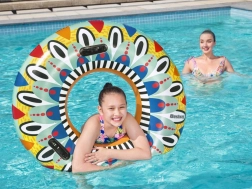 A Fiesta úszógumi élénk grafikájával és színes megjelenésével visszahozza a stílust és az örömöt a medencébe. A 107 cm-es átmérő és a két fekete fogantyú a könnyű megfogásért biztonságot nyújt 12 éves kortól és felnőttek számára is. Az integrált biztonsági szelep megkönnyíti a felfújást és a leeresztést, így a tárolás gyerekjáték.