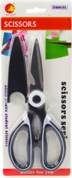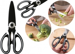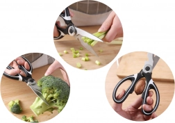 Az olló funkciói: üvegnyitó, diótörő, pikkelyező és klasszikus konyhai olló vágáshoz.