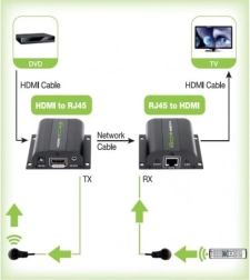 - HDMI hosszabbítás akár 60 m-ig egyetlen RJ45 kábelen (ajánlott Cat6/Cat7)
