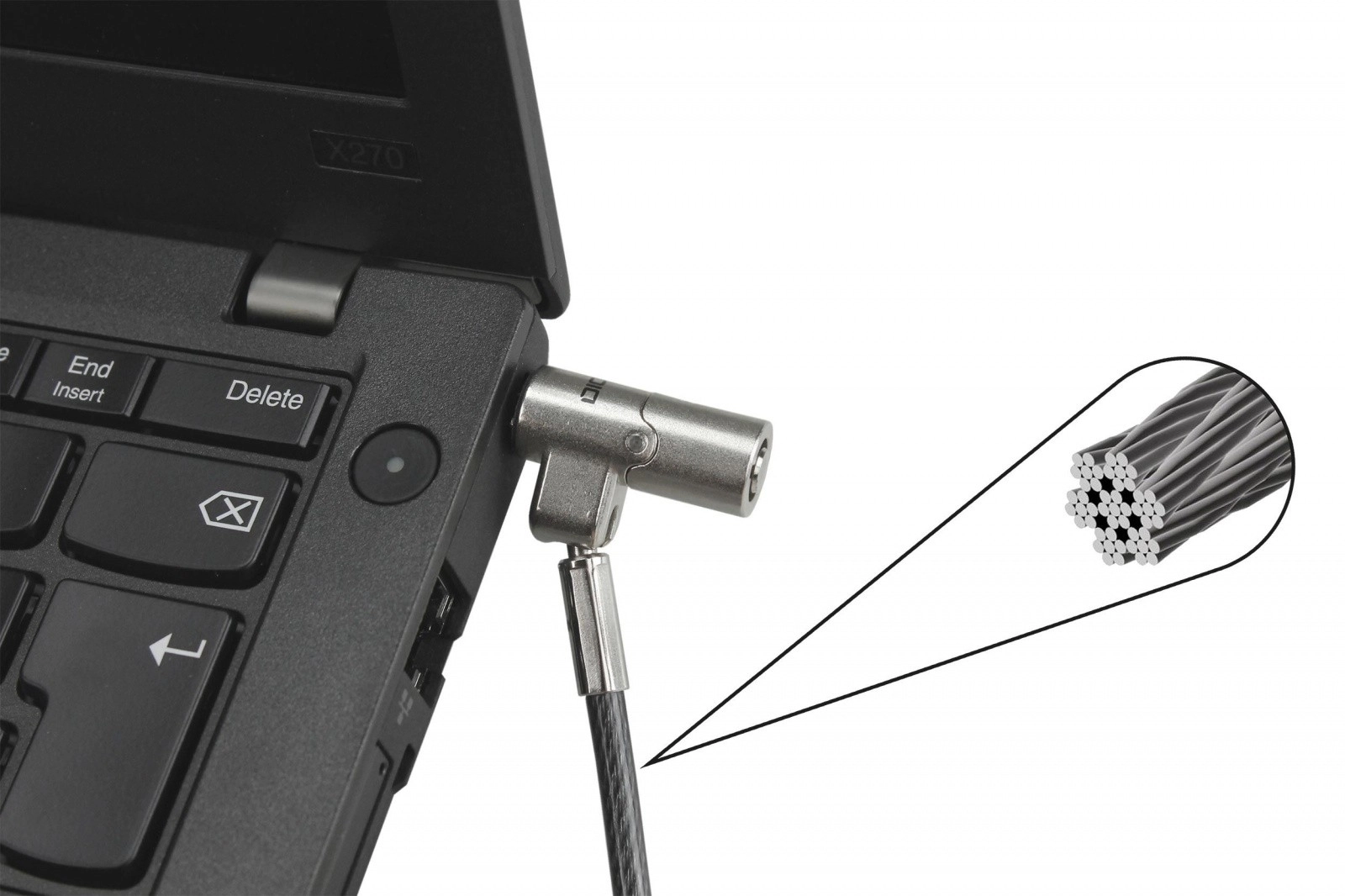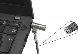 Ultravékony biztonsági kábel 2,5 × 6 mm-es nano nyílással rendelkező laptopokhoz, amely erős lopás elleni védelmet, tartós acélszerkezetet és egyszerű push-to-lock telepítést kínál. A forgatható és billenthető fejnek köszönhetően illeszkedik a karcsú laptopokhoz, és kényelmes használatot biztosít bármilyen munkakörnyezetben.