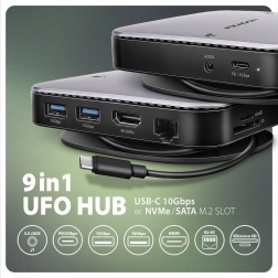 Ez a kompakt, 9 az 1‑ben dokkolóállomás egyetlen USB‑C portból gazdag csatlakozókínálatot varázsol. A beépített külső M.2 NVMe és SATA SSD rekesz (2242/2260/2280, M‑key/B+M‑key) gyors külső tárhelyet biztosít TRIM, UASP és S.M.A.R.T. kiolvasás támogatásával. Az alumínium fedél, a mellékelt passzív hűtőborda és a szellőzőnyílások hatékony hőelvezetést biztosítanak.