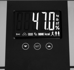 A kezelés rendkívül egyszerű: a SET gomb és a nyilak segítségével megadható az életkor (18–80 év), a magasság (100–220 cm) és az 1–5 közötti aktivitási szint; kiválasztható a nő/férfi/sportoló profil, a mértékegységek kg/lb/st pedig a készülék alján található UNIT gombbal válthatók. A mérés után a mérleg 60 s tétlenség után automatikusan kikapcsol, kíméli az elemet, és készen áll a következő használatra.