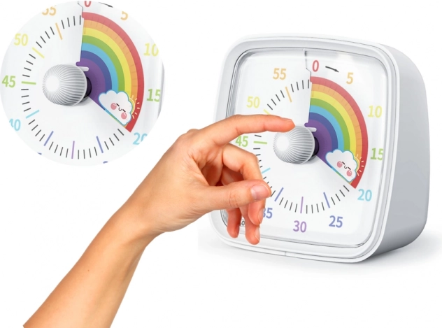 - Egyszerű használat: A jól olvasható számlap, percre osztott órarendszerrel, segít a gyerekeknek könnyen követni az időt.