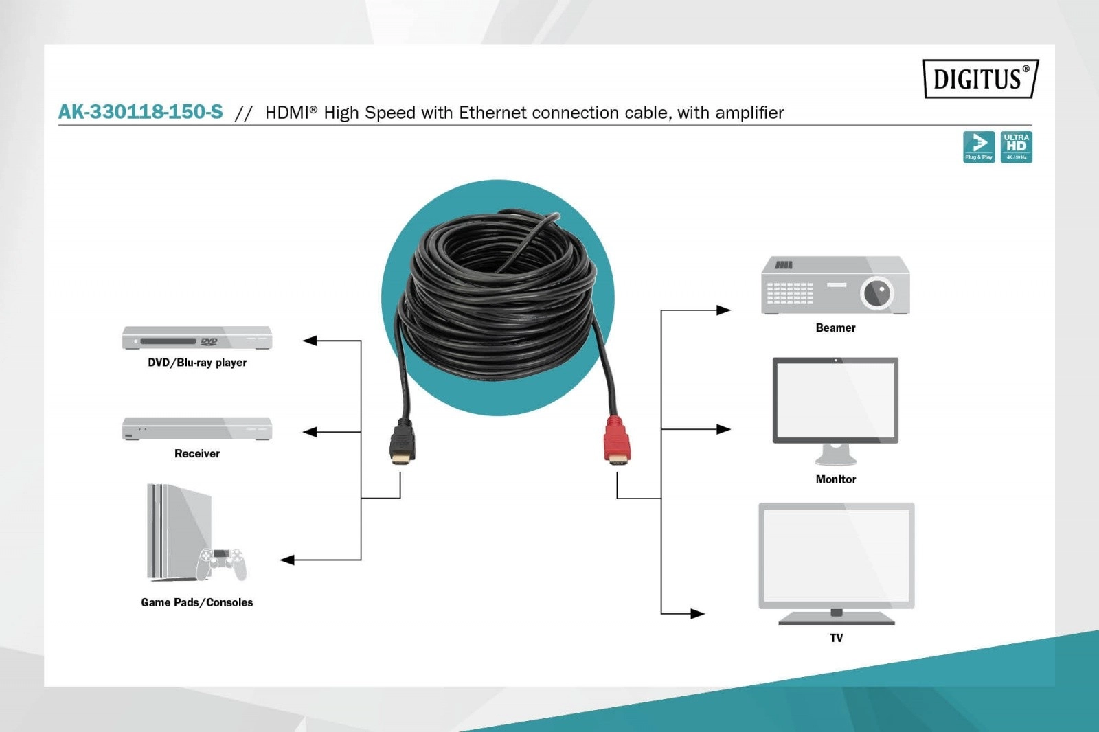 Ez az aktív, irányított HDMI kábel ideális számítógépek, játékkonzolok (pl. PS4), Blu‑ray/DVD lejátszók és más eszközök összekapcsolására tévékkel, monitorokkal vagy projektorokkal. A beépített erősítő stabil átvitelt tart fenn 15 m hosszon, így éles képet és minőségi térhangzást kap zavarok nélkül.