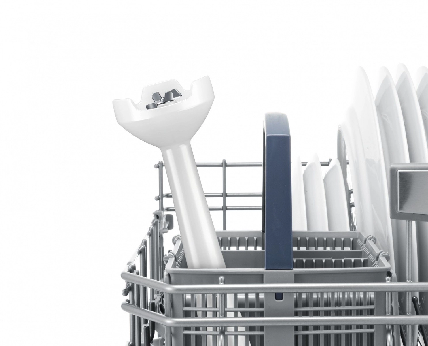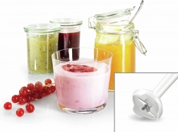 A csomag része egy univerzális aprító, amely egy szempillantás alatt felaprítja a zöldfűszereket, hagymát, dióféléket, csokoládét és kemény sajtokat – ideális házi pestóhoz és salsához. A mérőskálás keverőedény pontos adagolást biztosít. A fröccsenésgátló szárkialakításnak köszönhetően a munka tiszta és rendes, a kiválasztott alkatrészek mosogatógépben moshatók a könnyű karbantartásért.
