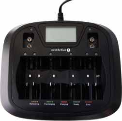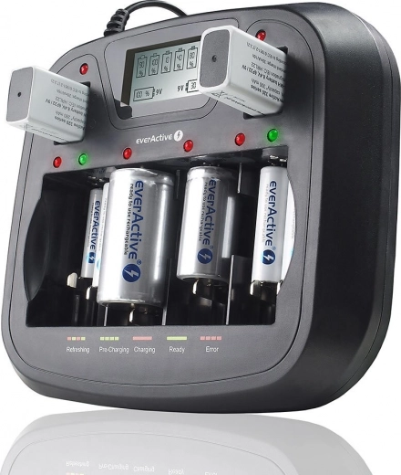 Olyan töltőt keres, amely a legtöbb szokásos és nagyobb cellával is megbirkózik, és páratlan számú akkumulátort is tud tölteni? Az EVERACTIVE univerzális, processzorvezérelt töltő 8 teljesen független csatornát kínál intelligens vezérléssel. Az újraélesztés (refresh) és a kisütés funkcióknak köszönhetően képes javítani Ni‑MH akkumulátorai kondícióját és meghosszabbítani élettartamukat.