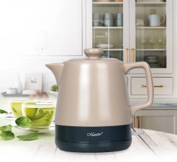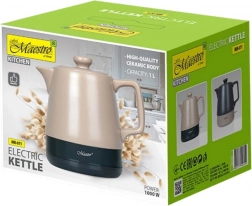 Stílusos MAESTRO kerámia vízforraló 1 l űrtartalommal és 1200 W teljesítménnyel, elegáns dizájnnal és könnyű karbantartással. A kerámia ház jól tartja a hőt és csökkenti a vízkőlerakódást, a 360°-os forgatható talp megkönnyíti a kezelést, a megvilágított kapcsoló és az automatikus kikapcsolás pedig növeli a biztonságot. Nem hiányzik a belső MAX jelölés, a rejtett fűtőelem és a kábelrekesz sem.
