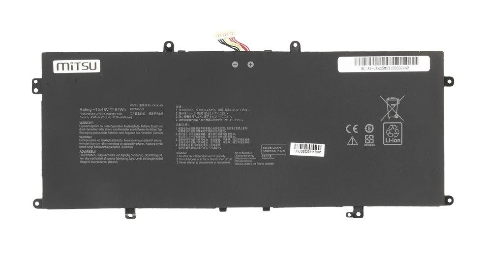 Megbízható csereakkumulátor a(z) MITSU C41N1904 modellből ASUS ZenBook és VivoBook ultrabookokhoz, valóban deklarált kapacitással 67 Wh és 15,48 V feszültséggel. Prémium, A osztályú Li‑ion cellákat használ, alacsony az önkisülése, nincs memóriaeffektus, valamint fejlett biztonsági védelemmel rendelkezik túltöltés, mélykisülés, túlfeszültség, túlmelegedés, rövidzárlat és túláram ellen. Ideális választás hosszabb útközbeni munkához és a laptop üzemidejének helyreállításához.