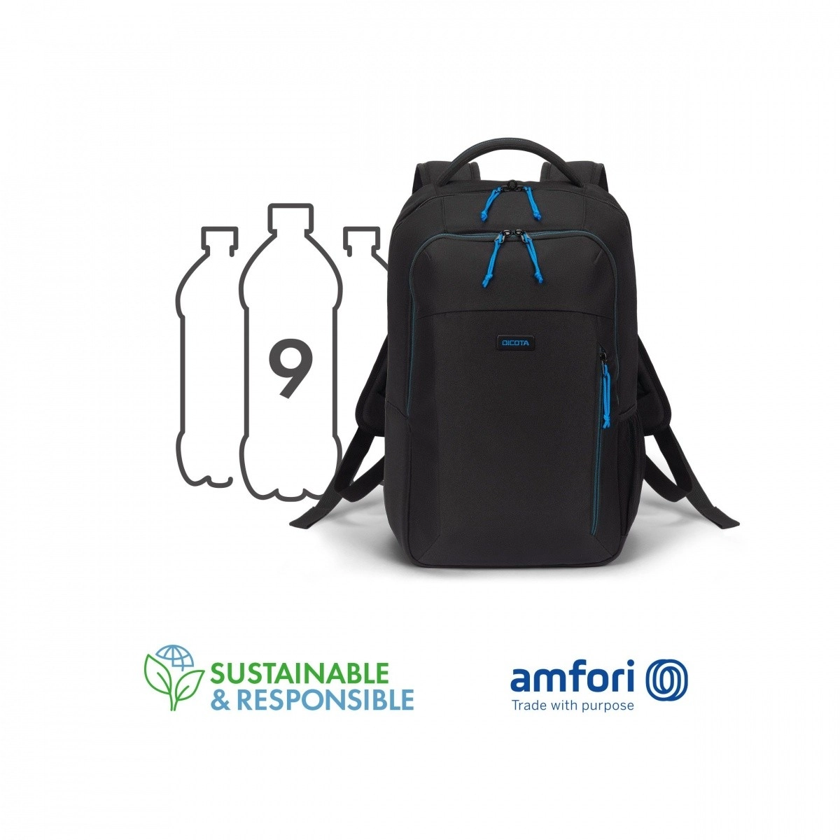 A hátizsák újrahasznosított PET-ből (9 palack) készült, ellenáll a mindennapi használatnak, és minőségi cipzárak, fém logó, valamint visszafogott kék részletek egészítik ki.