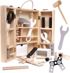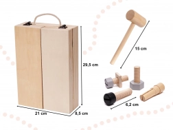 Nagy fa készlet, amely a kis barkácsolók álmait valósítja meg. Csavarhúzók, kalapács, csavarok, kulcsok - minden elem szükséges egy profi műhelyben. Gyerekeit óriási örömmel tölti el a korlátlan fúrás, szegek beverése és vágás lehetősége. A fogantyús fa doboz mobilissá teszi az egész készletet, így a gyerekek bárhová magukkal vihetik szerszámaikat bármilyen sürgős problémához.