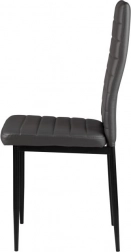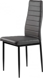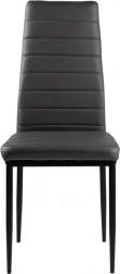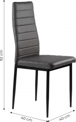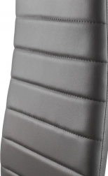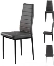A négy székből álló szett modern designnal és ergonomikus elemekkel remekül kiegészíti étkezőjét vagy nappaliját. A vízszintes varrással díszített szürke öko-bőr kárpitozás nemcsak jól néz ki, de maximális kényelmet is nyújt ülés közben. A fekete fém lábak stabilitást és tartósságot biztosítanak.