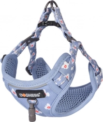 A könnyű, puhán párnázott és állítható hám könnyen alkalmazkodik a kutya testéhez. A biztonságos rögzítést fém gyűrű és megbízható karabiner garantálja. A modern világoskék, finom virágmintás kivitel stílust kölcsönöz sétáitoknak.
