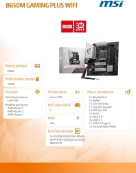 Az MSI B650M Gaming Plus WiFi alaplap az AMD Ryzen 8000/7000 sorozatú processzorokhoz készült, mely elképesztő teljesítményt nyújt asztali számítógépekhez. Támogatja a DDR5 memóriát akár 7200+(OC) MHz frekvenciával, ami gyors és hatékony munkavégzést biztosít a magas memóriaigényű rendszerek számára. A 10+2+1 Duet Rail tápegység rendszerének fejlett kialakítása és a dupla 8-pines csatlakozók révén készen áll az igényes feladatokra.