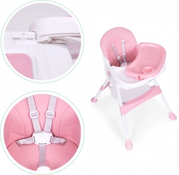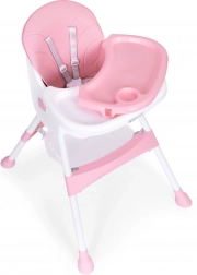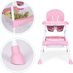 A széles tálca három pozíciója könnyen a gyermek növekedéséhez igazítható. A megemelt peremű felső rész pohártartóval levehető és mosogatógépben mosható, az alsó rész játékhoz és rajzoláshoz használható.