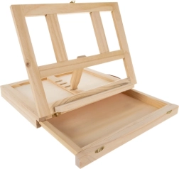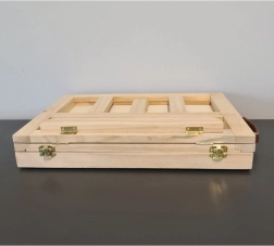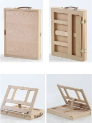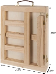A fa anyagból készült bőrönd fiókkal és állvánnyal rendelkezik, ami megkönnyíti a művészeti eszközök szállítását és rendszerezését.