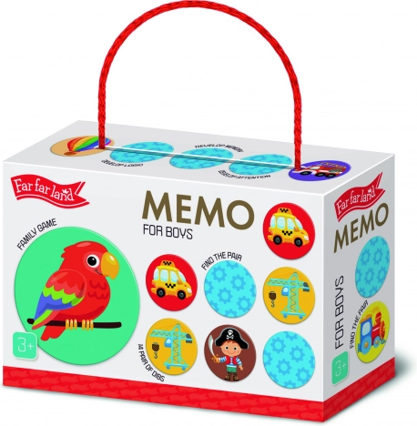 Far Far Land kerek memóriajáték fiúknak, 28 kártyával. Ideális a memória fejlesztésére és családi szórakozásra. 3 éves kortól ajánlott.
