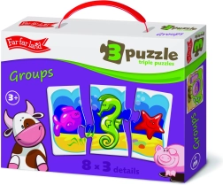 A Far Far Land kirakós hármas készletek csodálatos világot kínálnak, tele színes képekkel. Minden készlet 8 egyedi képből áll, amelyek 3 darabból állnak. Ezek a kirakósok nemcsak a gyerekek kreativitását támogatják, hanem a különböző tárgyak összekapcsolását és megkülönböztetését is segítik.