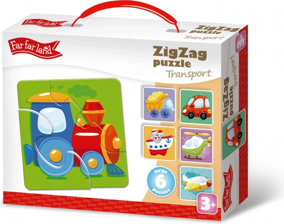 Far Far Land Puzzle ZigZag szórakoztató közlekedési motívumot hoz hat gyönyörűen színes képpel. A speciális cikcakkos vágás biztosítja, hogy a játék még szórakoztatóbb legyen és fejleszti a gyerekek logikáját és motoros képességeit.<9div>