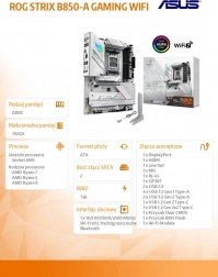 A ROG Strix B850-A Gaming WiFi elegáns fehér kivitelben új szintre emeli PC-det. Készen áll a 9000-es sorozatú AMD Ryzen processzorokra, és csúcskategóriás sávszélességet nyújt a PCIe 5.0-nak, nagy órajelű DDR5 memóriáknak, valamint rendkívül gyors kapcsolódásnak köszönhetően USB 20 Gb/s-on és Wi‑Fi 7-en keresztül. Mindez robusztus kialakítással, megerősített slotokkal és hatékony hűtéssel.