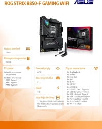 A ROG Strix B850-F Gaming WiFi az AMD platform lehetőségeit csúcsszintű tápellátással, hatékony hűtéssel és intelligens optimalizációkkal tolja ki. A nagy USB sávszélesség – beleértve a 20 Gb/s-t –, a legújabb Wi‑Fi 7 és a 2,5 Gb Ethernet villámgyors csatlakozást biztosít perifériákhoz, tárhelyhez és hálózathoz. Az alaplap felkészült a nagyigényű konfigurációkra több meghajtóval és gyors grafikával, miközben megőrzi a kívánt stabilitást és alacsony hőmérsékletet.