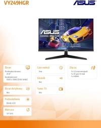 Az ASUS VY249HGR egy sokoldalú, 23,8"-os IPS monitor, amely ideális játékhoz, multimédiához és mindennapi munkához. A Full HD felbontás és az IPS széles betekintési szögei éles képet és pontos színeket nyújtanak. A 120 Hz-es képfrissítés 1 ms MPRT-vel kombinálva csökkenti a mozgáselmosódást, így a gyors jelenetek tiszták és simák.