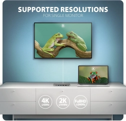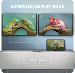 A hub két USB‑A 5 Gbps és egy USB‑C 5 Gbps adatportot biztosít, tartósan képes több külső meghajtót is kiszolgálni, és lehetővé teszi telefonok és tabletek töltését akár 1,5 A/5 V értéken. A két HDMI kimenet akár 4K/60 Hz (támogatott továbbá 2K/120–144 Hz és 1080p/240 Hz) jelet továbbít, beleértve a HDR-t és a többcsatornás hangot. A fémház tartósságot és hatékony hőelvezetést biztosít.