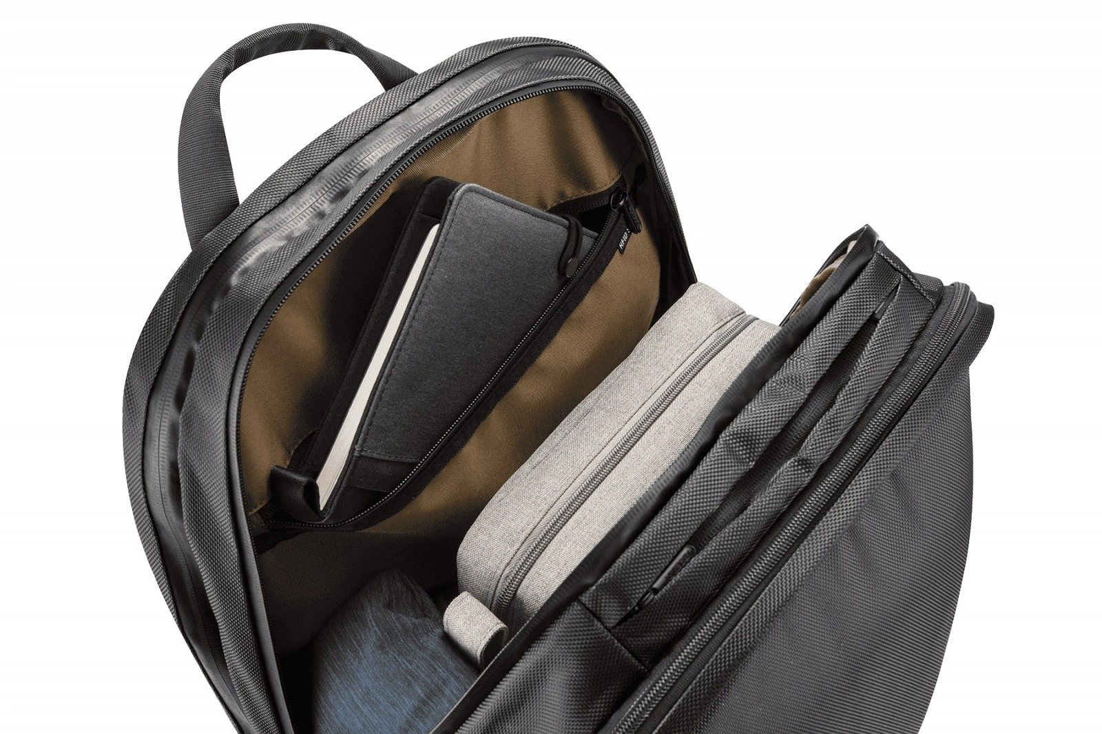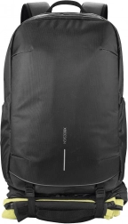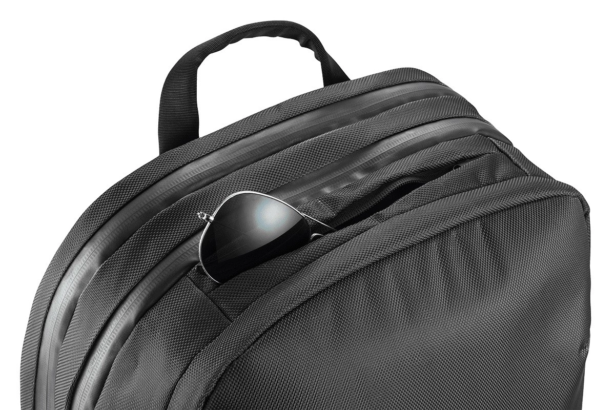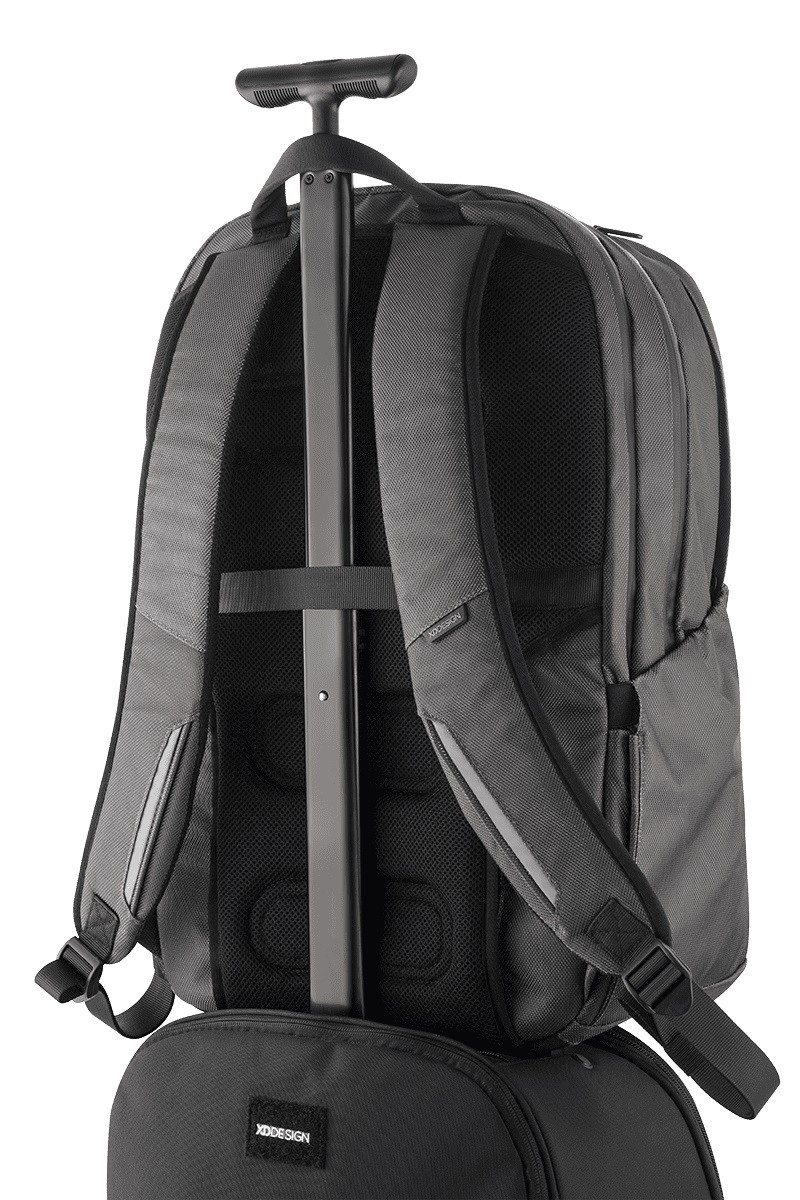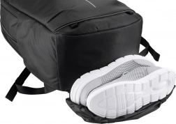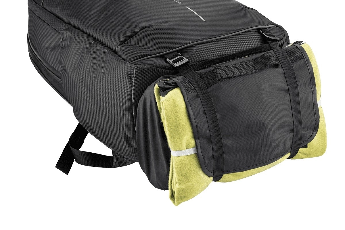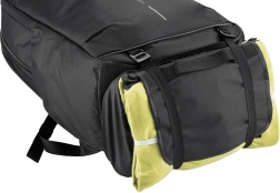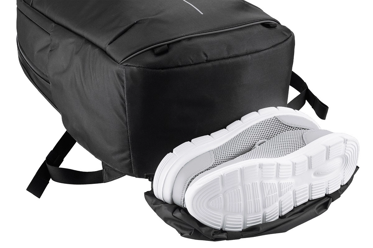 A praktikus, bővíthető alsó zseb ideális cipőnek, szennyesnek vagy nedves ruhának. A térfogat a felső cipzárral könnyen állítható 26-ról 30 literre. Oldalsó palacktartó zseb, mágneses zárás, fényvisszaverő elemek a jobb láthatóságért, valamint rögzítési lehetőség a bőrönd teleszkópos fogantyújára sem hiányzik.